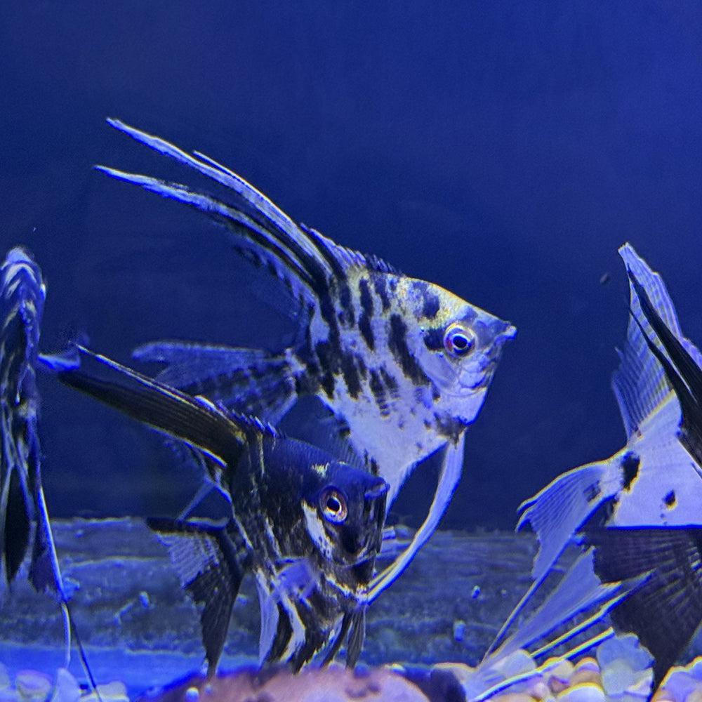 Freshwater Angels come in a variety of different colours and patterns, with long wispy fins that flow elegantly behind them.