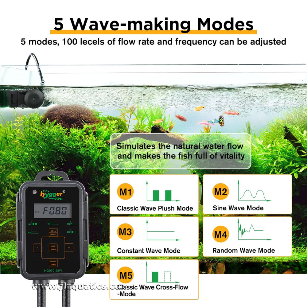 - Multi-Functional Wave Pump - This powerful wave pump offers five wave modes - pulse wave, sine wave, constant wave, random wave, and cross flow wave - and three working modes: feeding mode, night mode, and linkage mode. With adjustable flow rates (1-100 levels) and frequency levels (1-100 levels), it provides extensive customization for your aquarium's needs.