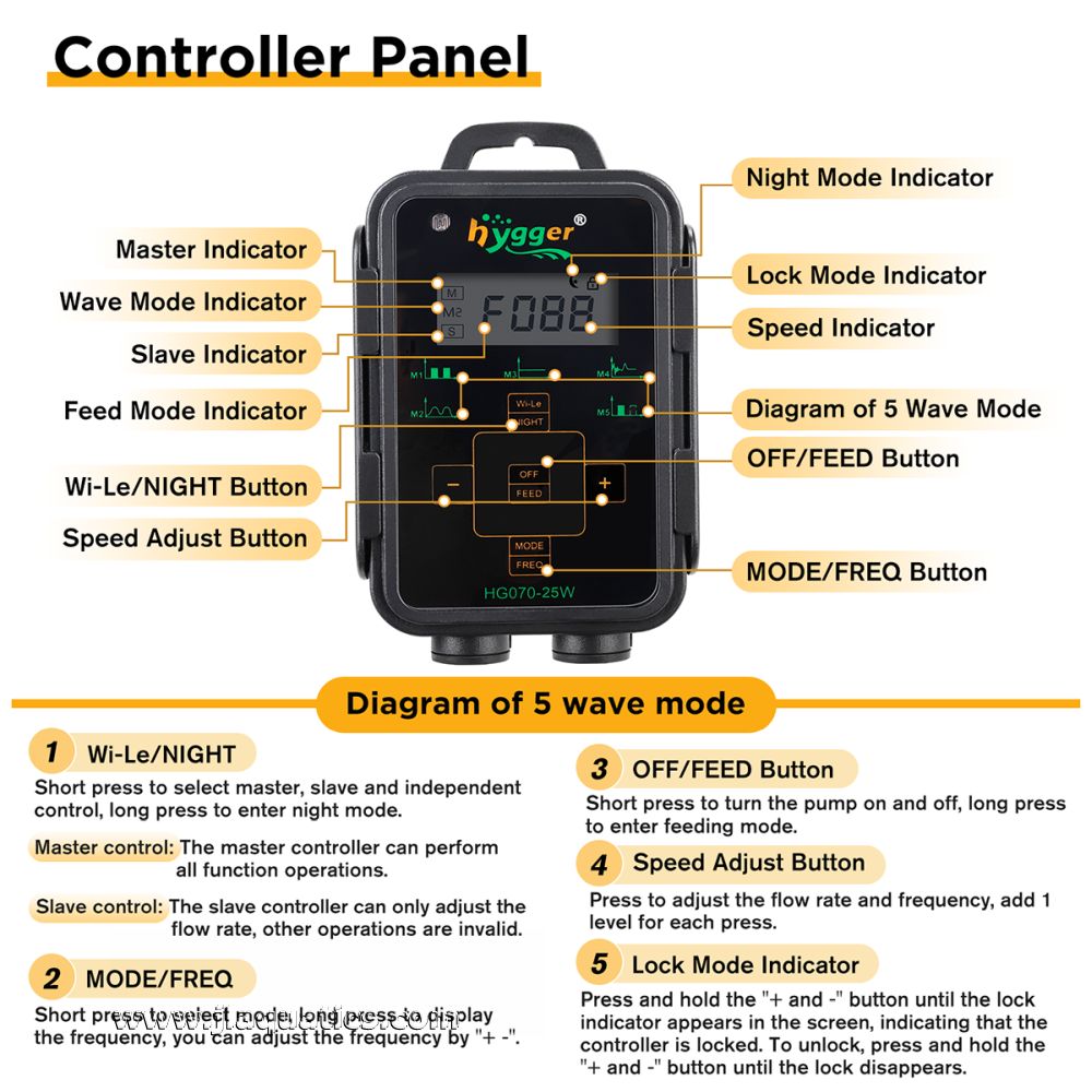 - Multi-Functional Wave Pump - This powerful wave pump offers five wave modes - pulse wave, sine wave, constant wave, random wave, and cross flow wave - and three working modes: feeding mode, night mode, and linkage mode. With adjustable flow rates (1-100 levels) and frequency levels (1-100 levels), it provides extensive customization for your aquarium's needs.