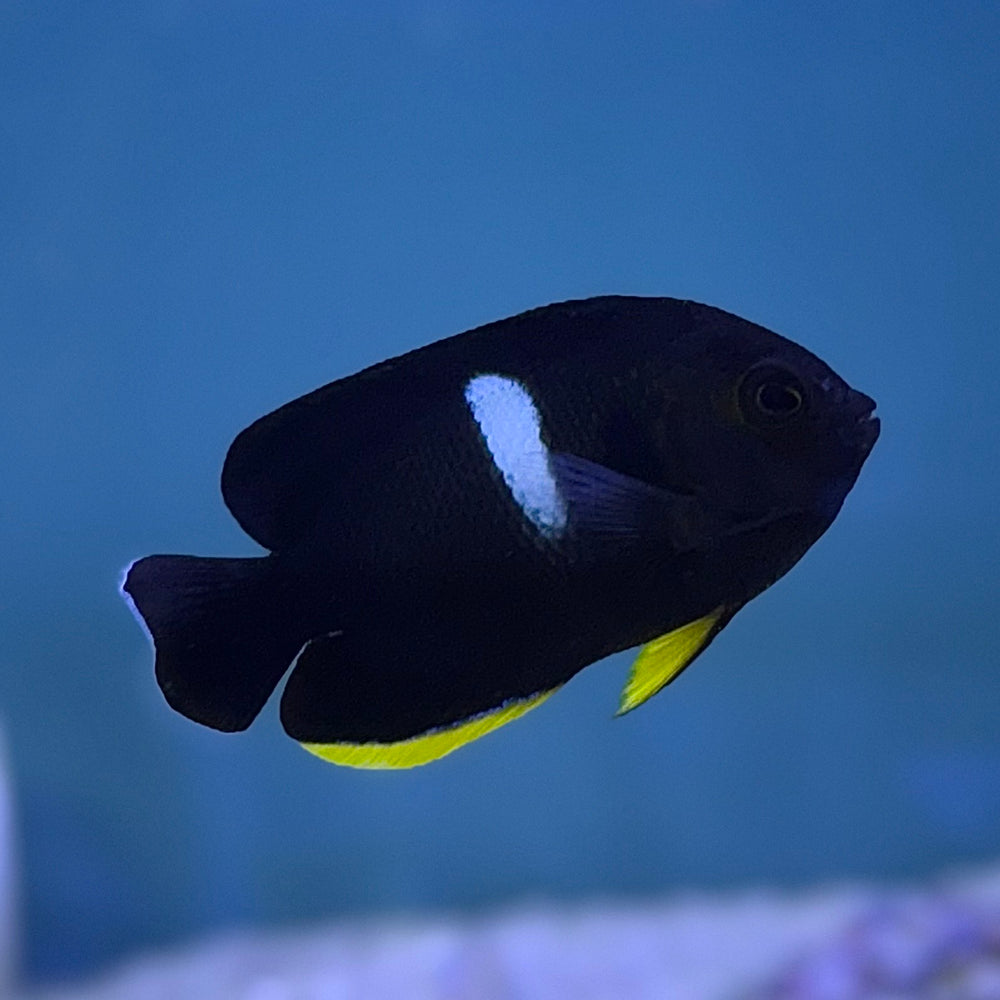The Keyhole angel is overall an intense dark black with what appears to be a bright light shining through a hole in its side, like the light from a keyhole in a door. Its lower fins are dipped in a lovely lemony yellow. Males and females are visually identical.
