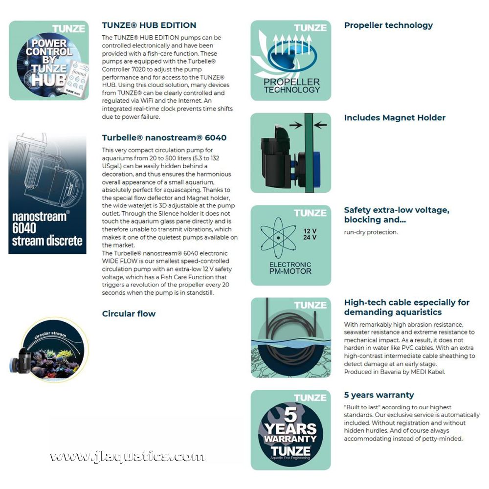 The Nanostream® 6040 Hub Edition adds cloud-connected control via TUNZE HUB and Turbelle Controller 7020. Program up to 24-hour wave, Flow and Fish-Care cycles. Its magnetic-bearing drive, Silence clamp mounting and 3D deflector deliver natural circulation for 20–500 L (5.3–132 US gal) tanks with blocking & run-dry protection and a 5-year warranty.Features